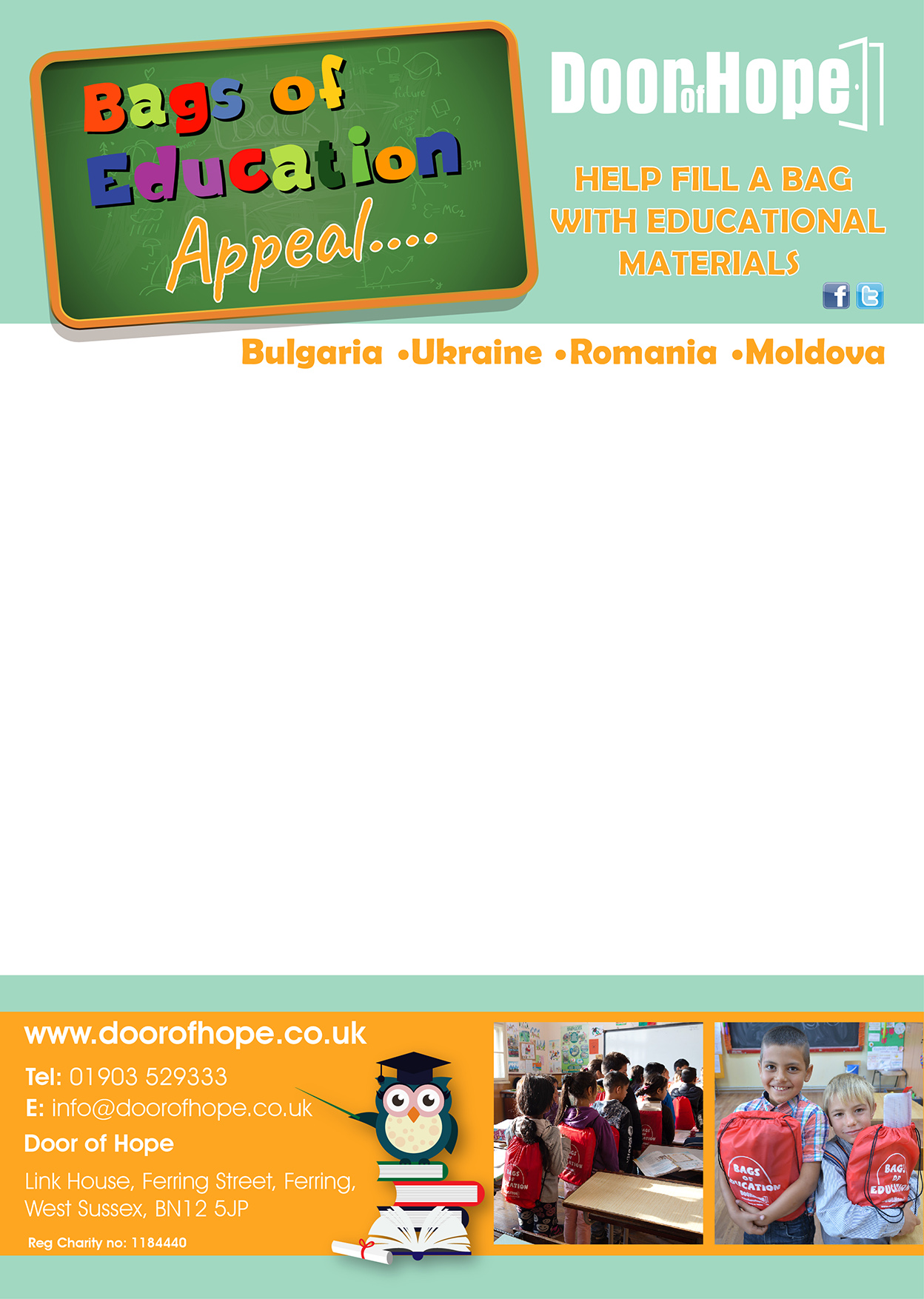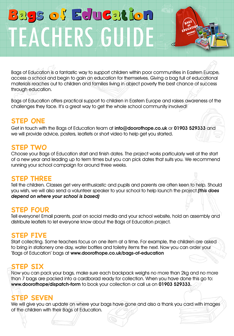 We have attached an Appeal Leaflet which is essentially a flyer, these can be distributed to people and groups who are also interested in being involved with the ‘Bags of Education’ appeal. – Please feel free to click on the Appeal Leaflet to download and print off. Should you require a larger quantity, contact Simon on info@doorofhope.co.uk.